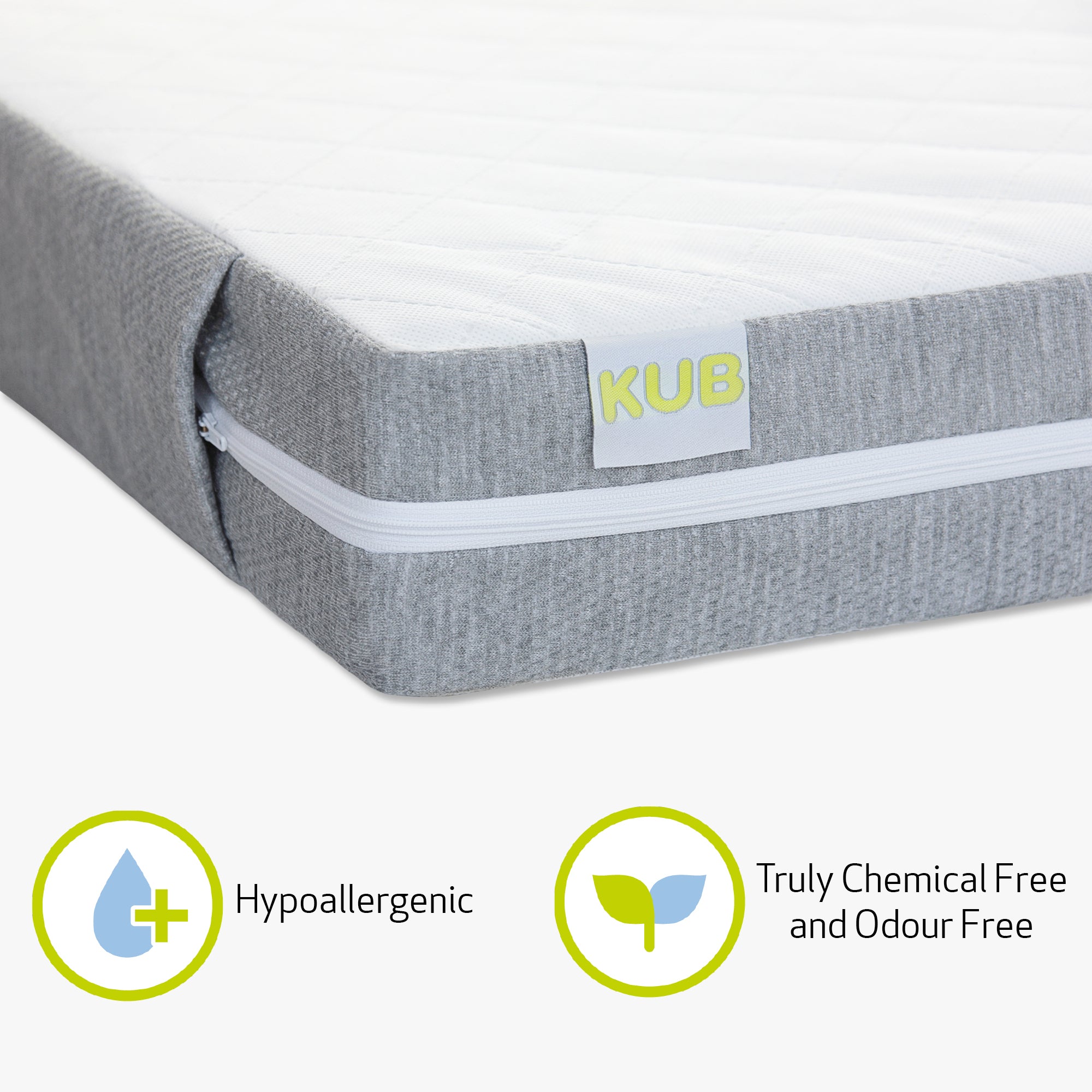 The KUB Cool Eco Flow Mattress provides your baby with optimum comfort and support. The Ecoflow fibre mattress is handmade using high-quality British dent-resistant ECO tech fibre and finished with a removable premium handmade quilted Freshtec cover. The mattress cover is hypoallergenic. The unique open-cell structure reacts to the baby's body heat and weight, moulding to the body's contours, ensuring perfect breathability and keeping the baby's skin soft.