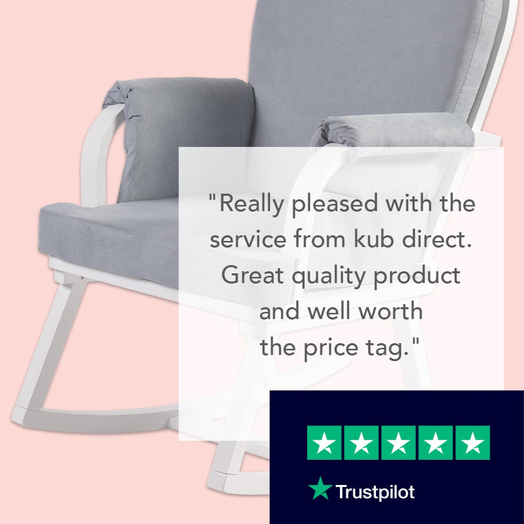 The Meadow Rocking Chair is a pastel-coloured addition to the Kub Nursing Rocking Chair range. Its front leg design maximises space, making it ideal for smaller nurseries. The chair features a modern style with soft microfibre fabric, perfect for feeding or relaxing. Made from solid wood, the cushions are removable and easy to clean with a damp cloth.
