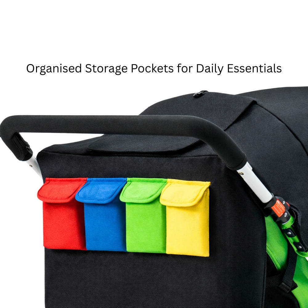 Designed for busy childcare environments, it offers large colourful storage pockets, full-length storage compartments, and spacious rear baskets—ideal for bags, toys, snacks, and daily essentials. A large removable canopy provides protection from sun and light rain, with a rain cover included to keep you prepared in all weather.