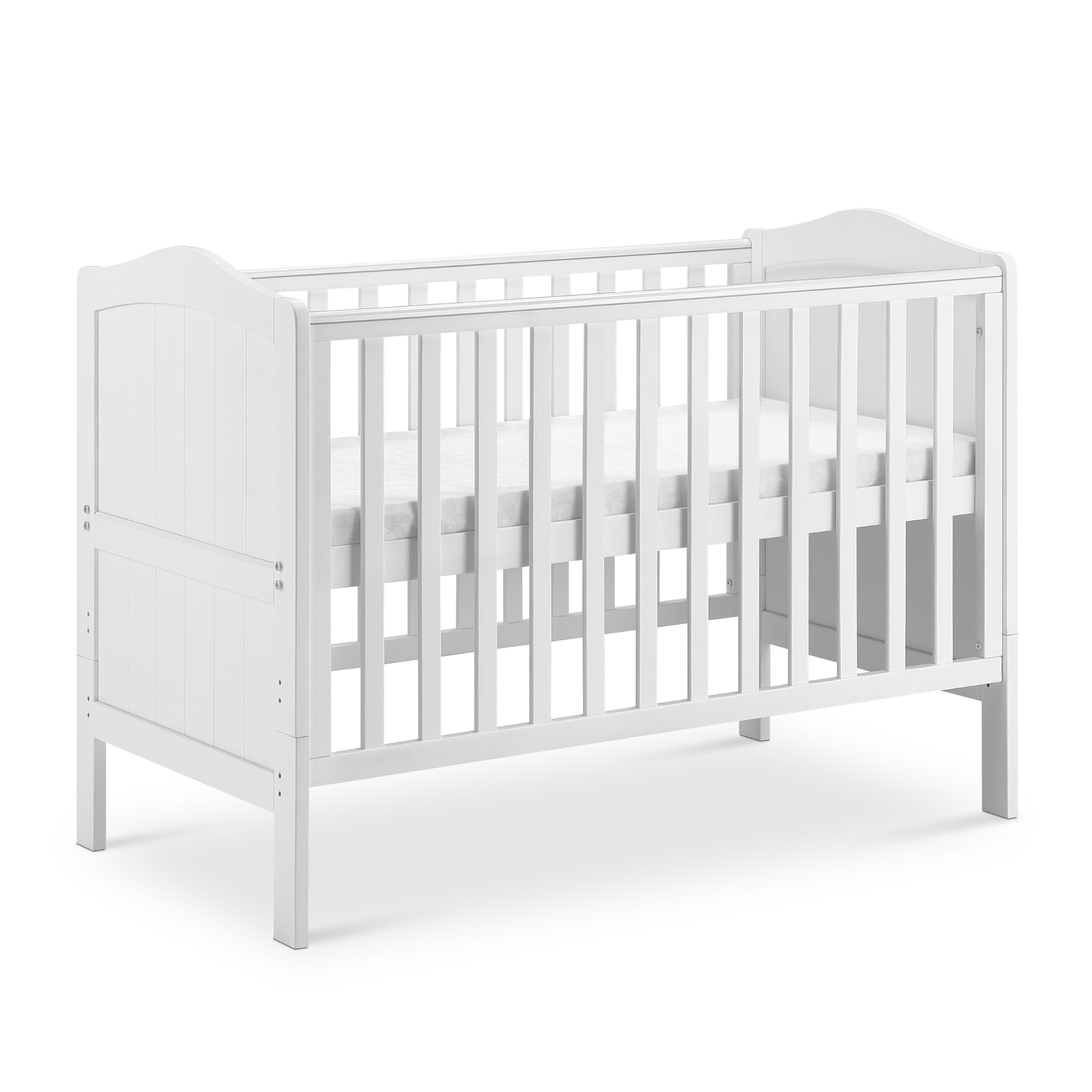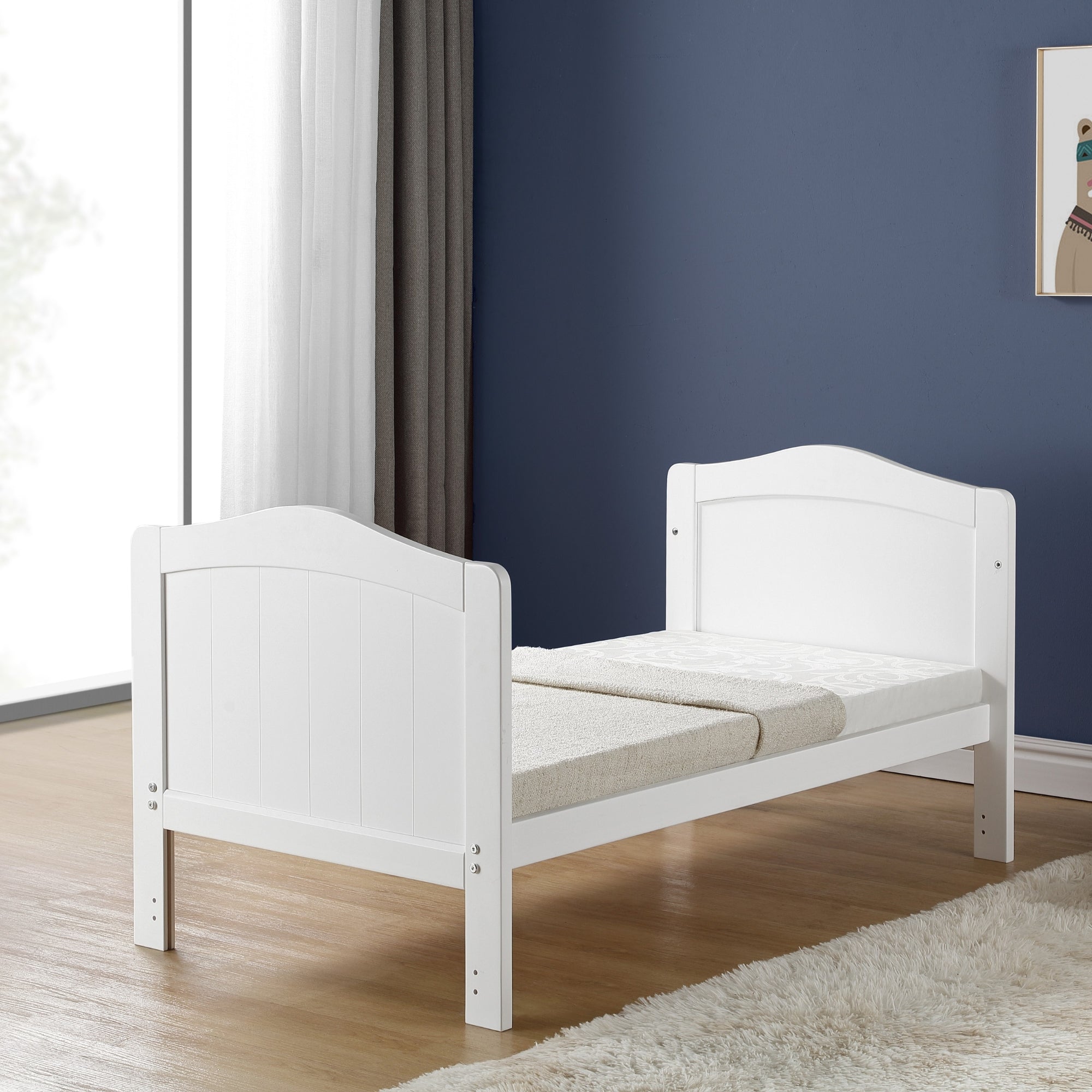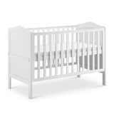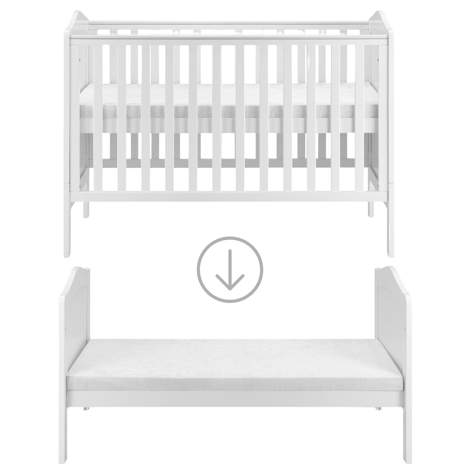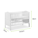From birth to toddler, this smaller, affordable Seville cot bed is perfect for your nursery. Ideal for small rooms and apartments. When your child is old enough, the sides to the cot can be removed to transform it into a bed. With a clean white colour, this bed is perfect for matching any nursery theme. Classic cot bed in white smooth finish. Teething rails on sides.